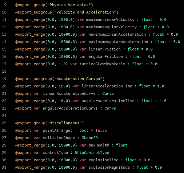 # Inside ShipController.gd @export_group("Object References") @export var shipInput : ShipInput @export var shipSettings : ShipSettings: set(value): shipSettings = value if shipSettings != null: apply_settings(shipSettings) ship_settings_changed.emit(shipSettings) # (more variables)...