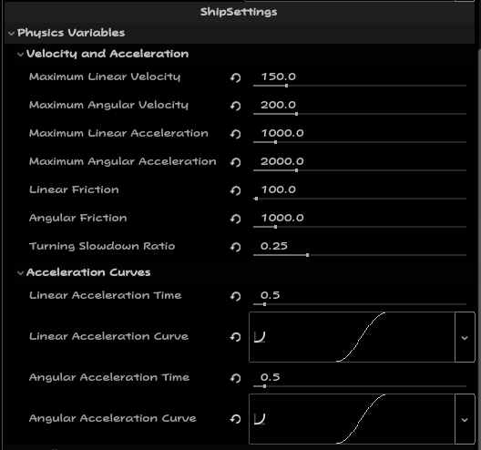 As seen with the aforementioned Resources, player ships, enemy ships, and projectiles make use of various values and constraints for movement. When moving or turning, these controllers not only change their linear and angular velocity over time with acceleration values, but that acceleration is changed over time using Godot’s Curves data type. Affecting the change in acceleration over time — “jerk" — allows for even finer control over how a ship can move and proliferates emergent movement behaviors. Obtaining the correct value along the curve is straightforward, as all it takes is calling the “sample()” function with a value between 0 and 1.