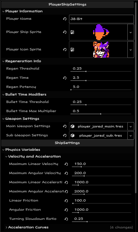Rather than tethering all of a ship’s attributes to the script attached to the main character body, I created a custom “Ship Settings” Resource that handles all of that data instead. Not only does this provide a solution to the aforementioned problem, but it also makes it incredibly easy to instantiate new ships/projectiles (no need to store a scene, just the data) and change attributes on-the-fly (player character swapping). This system extends to the player, where information meant to be displayed on the UI, main and sub-weapons, and health regeneration speeds and thresholds are stored.
