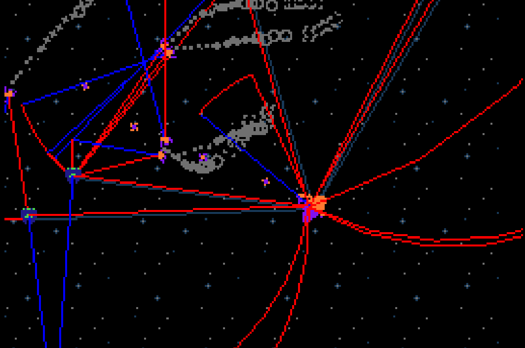 For player ships, movement is controlled with a keyboard or gamepad using tank controls, which are stored in a 2D vector for handling movement. For enemies and projectiles, it uses the same input system, making use of a 2D vector for movement though getting those inputs through more complex logic. When targeting something, the ship controller will factor in its current angular velocity and acceleration in order to know when to speed up or slow down to within a specific margin of error towards its target. Ships also have an option to slow down when the angle between its target and itself is too great. Finally, for the auto-player system, it will actively chase targets until a specific distance, in which case it cranks itself in reverse while still aiming towards enemies and steering away from incoming attacks.